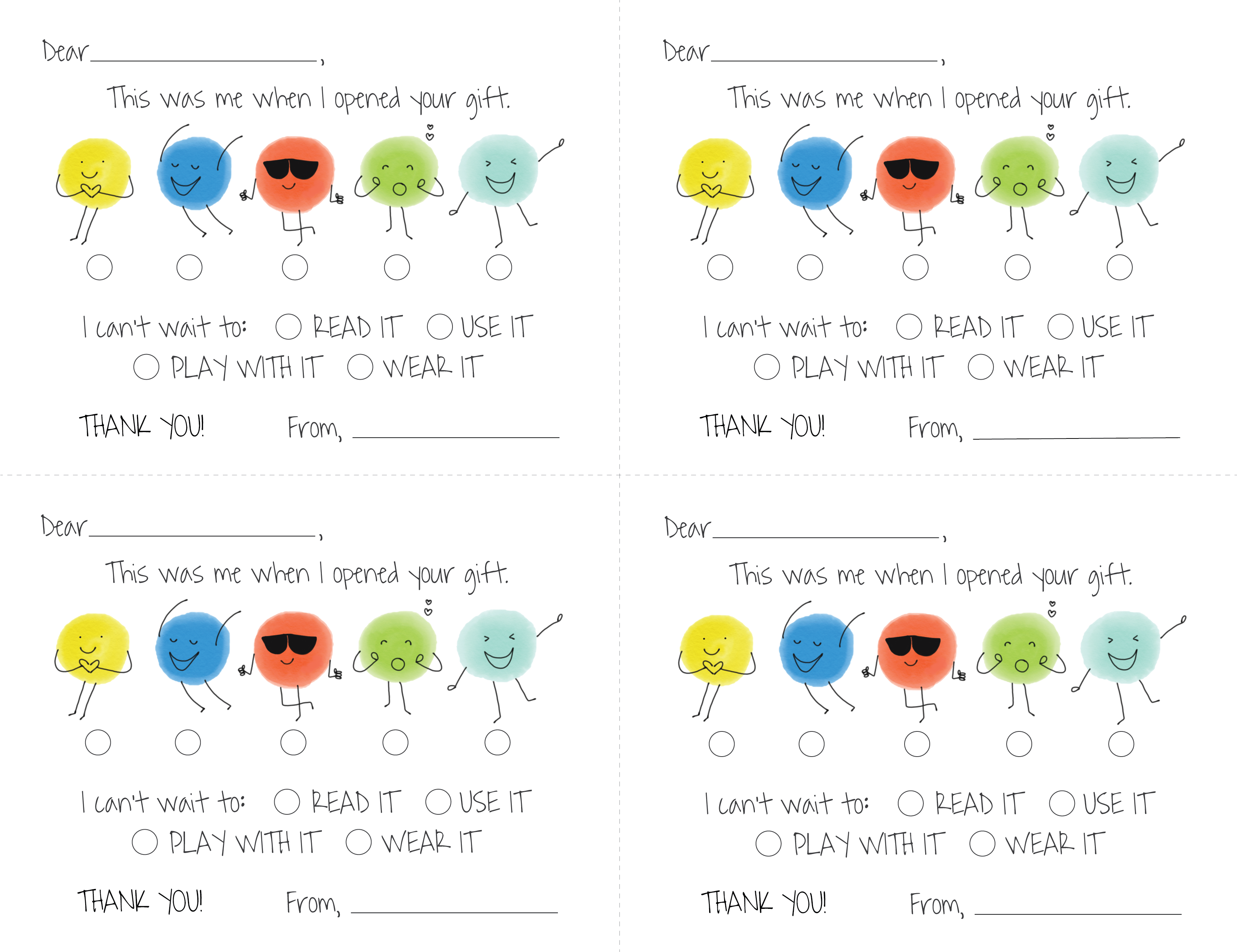 Designed for young children, our cute characters & simple check-off layout makes writing thank you notes fun instead of frustrating. The expressive characters allow the child to share how they felt about the gift & how they are looking forward to using it.